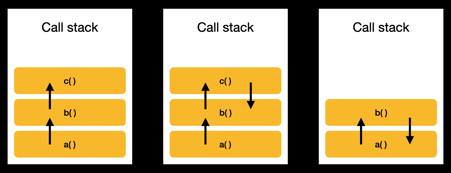 function c(){ console.log('C'); } function b(){ console.log('B'); c(); } function a(){ console.log('A'); b(); } a(); // call stack에는?