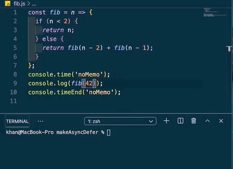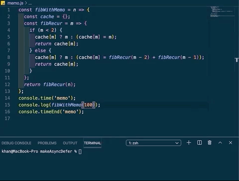 const fibWithMemo = n => { const cache = {}; const fibRecur = m => { if (m < 2) { cache[m] ? m : (cache[m] = m); return cache[m]; } else { cache[m] ? m : (cache[m] = fibRecur(m - 2) + fibRecur(m - 1)); return cache[m]; } }; return fibRecur(n); };값이 cache에 없으면 그 값들을 하나씩 저장하고 cache에 해당 값이 있으면 사용하는방식이다.
