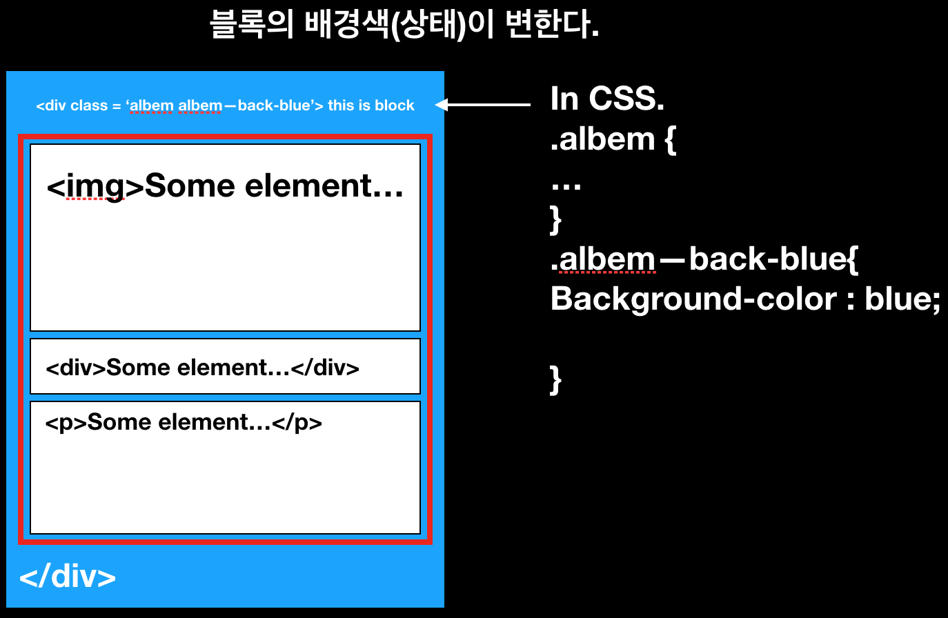 - ex. class= "albem albem--border-red" (블록에서), class= "albem__title albem__title--color-red" (엘리먼트에서)
